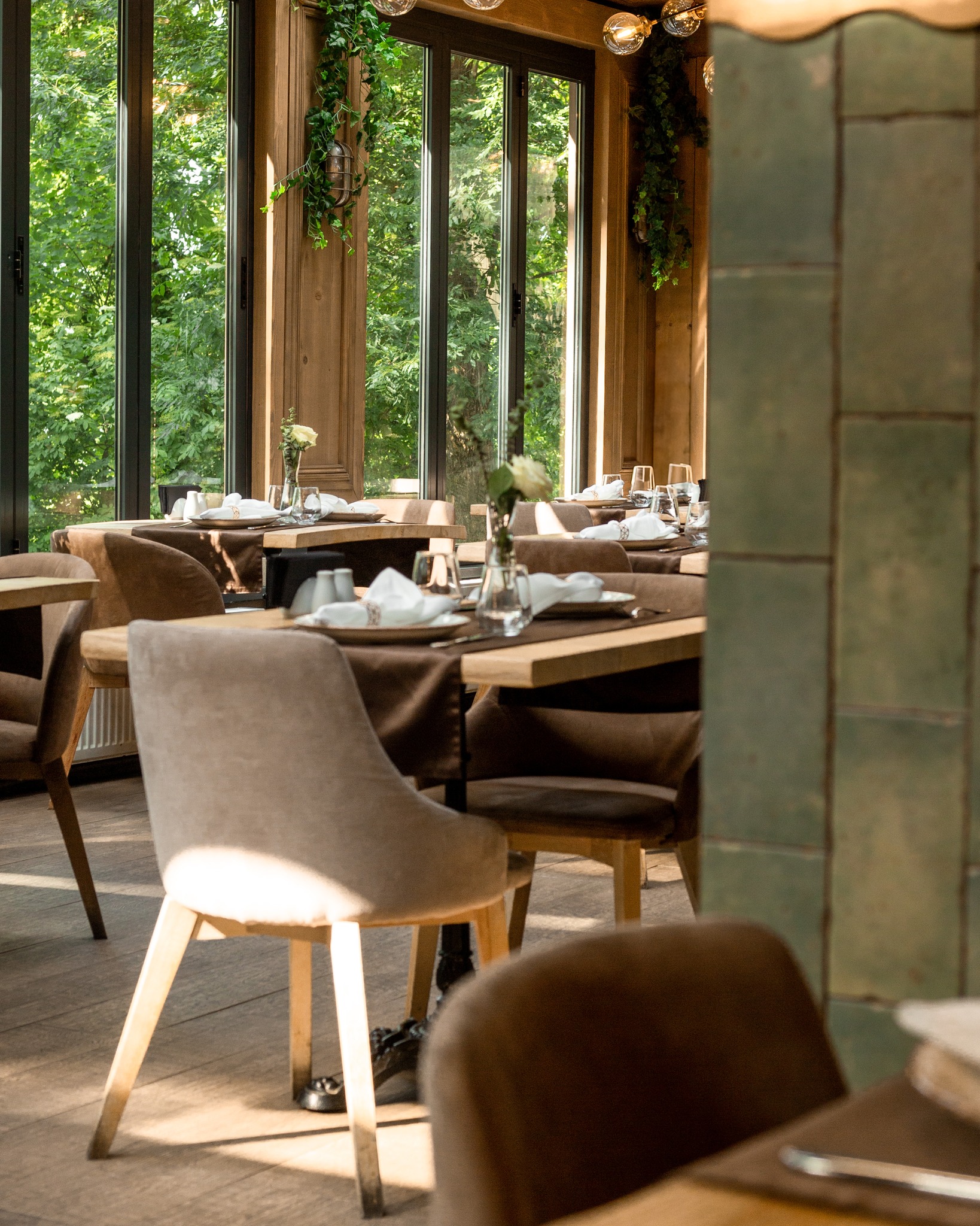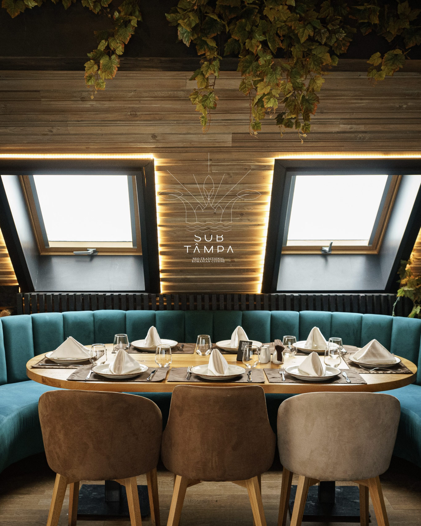 Restaurant amplasat la poalele muntelui Tâmpa, pe Aleea pietonală sub Tâmpa, Brașov. Design interior care „poartă spre liniștea și frumusețea naturii”.